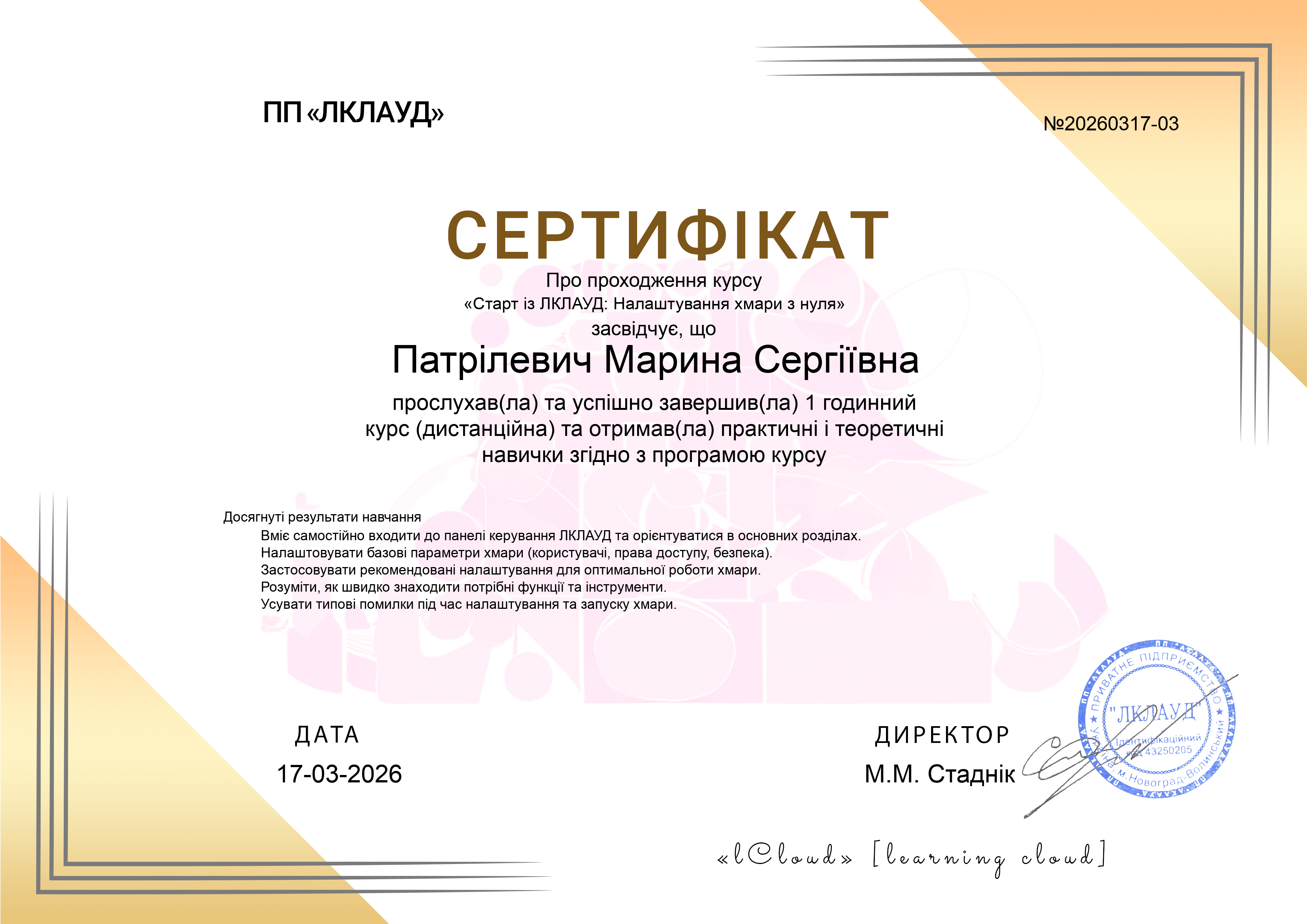 Патрілевич Марина Сергіївна17.03.2026Сертифікат № 20260317-03